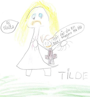 ”Man rivs och slåss, en pojke tar fotbollen från en annan och rivs”. – Där fick du för att jag inte fick din fotboll! – Kan jag få tillbaka min fotboll?
